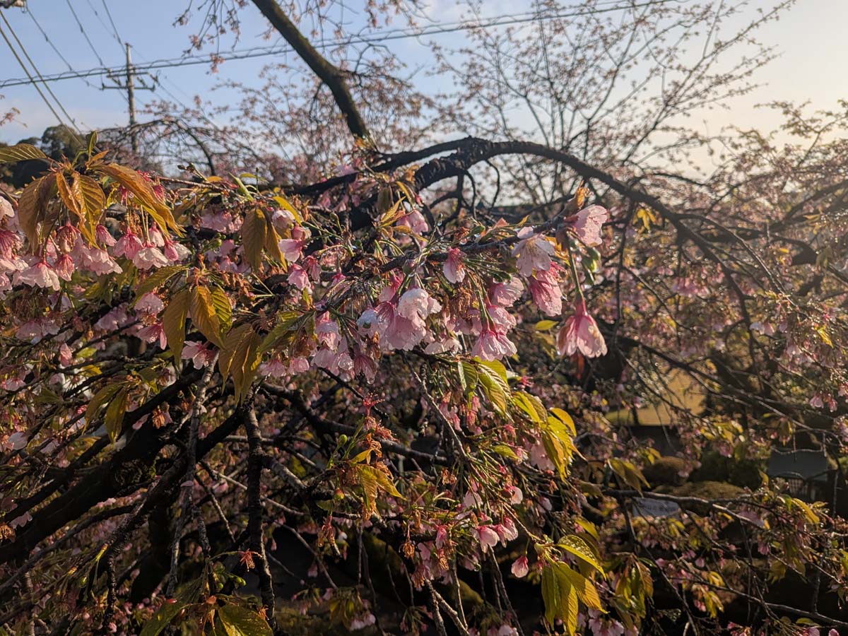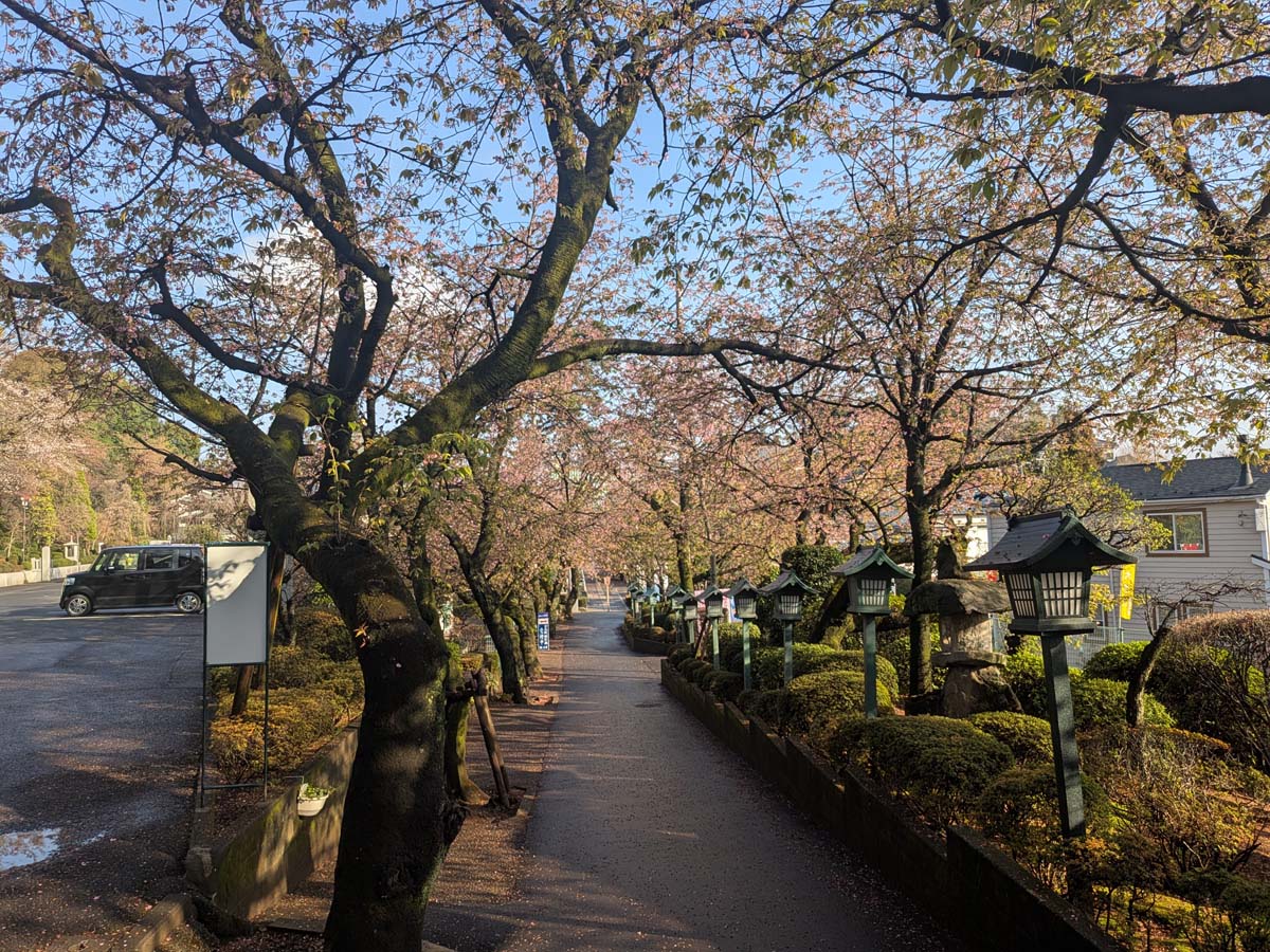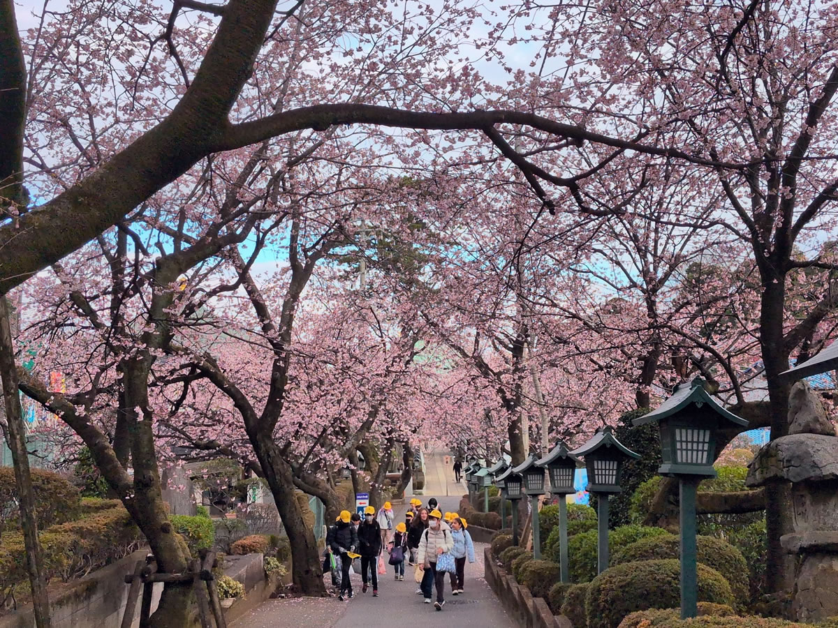 安行桜は染井吉野よりも一足早く満開を迎えます。沖田桜とも呼ばれる安行桜はピンクの色彩がやや濃く、花が少し小ぶりで、遠景ではやわらかいイメージに映ります。密蔵院では数十本の安行桜が境内の要所に植林され、早春に美しい景観を楽しむことができます。春のお彼岸に早咲きの安行桜が満開になるので、多くの参拝客で賑わいをみせます。
